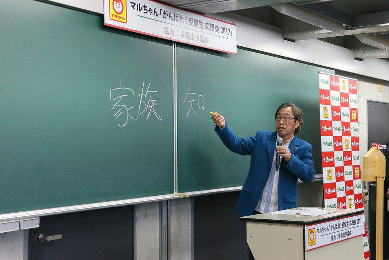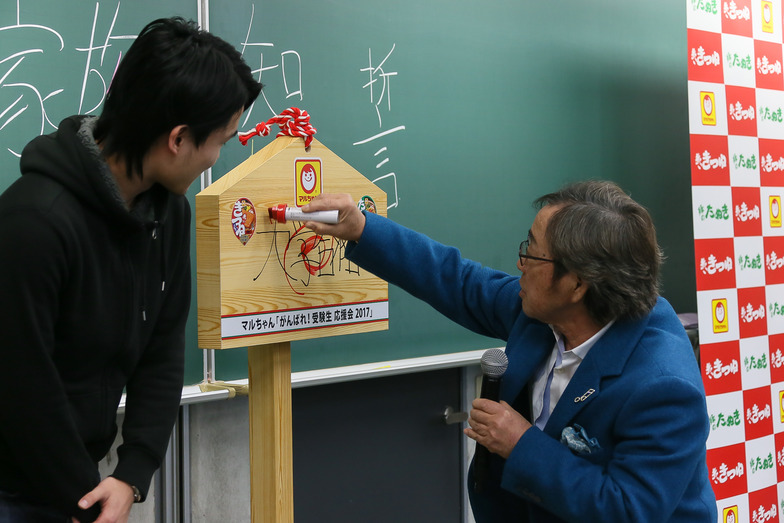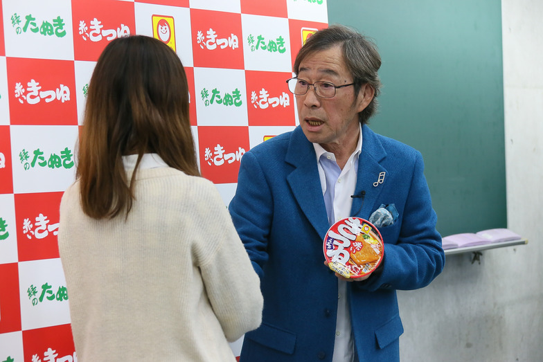 Actor Tetsuya Takeda, who has served as the CM character for "Maruchan Akai Kitsune to Midori no Tanuki" for nearly 40 years since its launch, took the stage set up in the classroom. Sharing his own exam experience, he encouraged the students facing the upcoming National Center Test for University Admissions, stating, "While exam life is often called gray, the meaning of that time lies in repelling that gray and adding your own color."