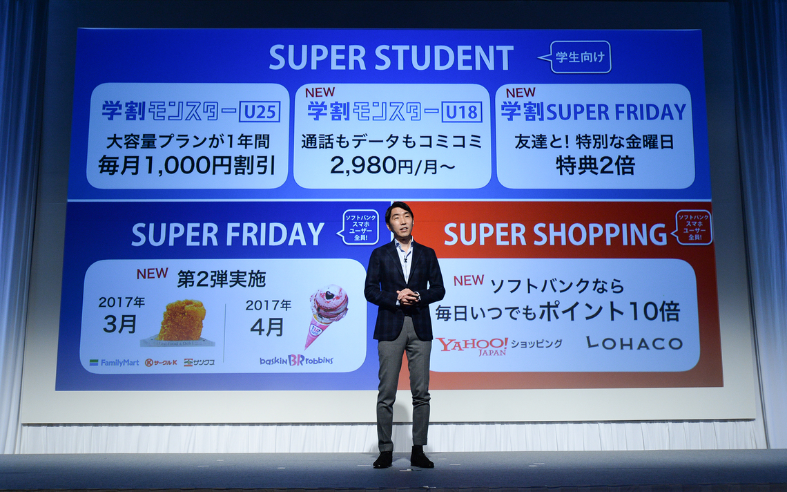 The first is the second installment of "Super Friday," launching in March. For the company's smartphone users, this offers one free Famichiki from FamilyMart on Fridays in March and one free regular single scoop from Baskin-Robbins in April. Kanno expressed the hope that users would experience "Fridays are fun with SoftBank."
