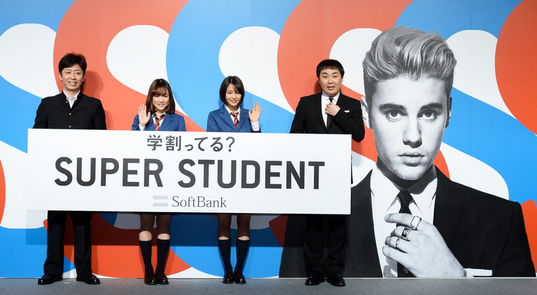 The CM is set at a high school. Actresses Suzu Hirose and Sakurako Ohara appear as students. Walking around the campus, Hirose declares that their generation has grown up with digital and global norms, stating, "We're the first humans to grow up with smartphones." On a school electronic bulletin board, global superstar Justin Bieber appears, conversing with Hirose: "Got student discounts?" "Got 'em!" They promote the "Super Student" campaign from a student's perspective.