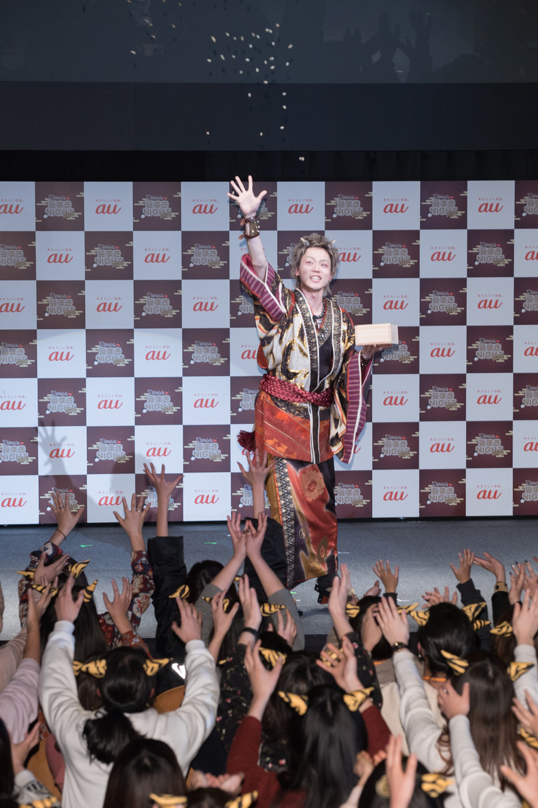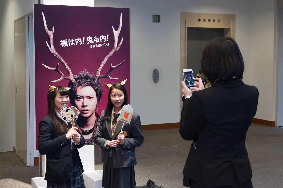 On the day, 200 students selected by lottery attended and enjoyed Setsubun festivities with actor Masaki Suda, who plays "Oni-chan" in au's "Santaro Series" TV commercials. The company had announced "au's Student Discount Heaven," offering services appealing to students, at a January press conference.