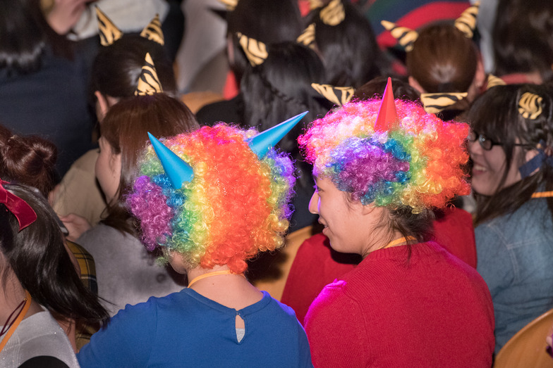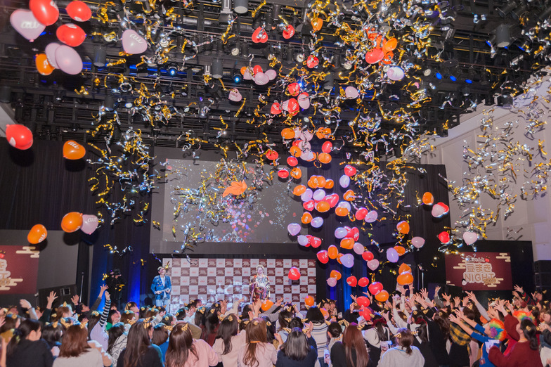 For the main event, after Mr. Suda threw beans toward the audience, everyone then threw beans at a large balloon hanging from the ceiling, chanting "Fuku wa uchi! Oni mo uchi!" (Good fortune in! Demons in too!). When the balloon burst, releasing balloons and streamers, the venue erupted in the loudest cheers of the day.
