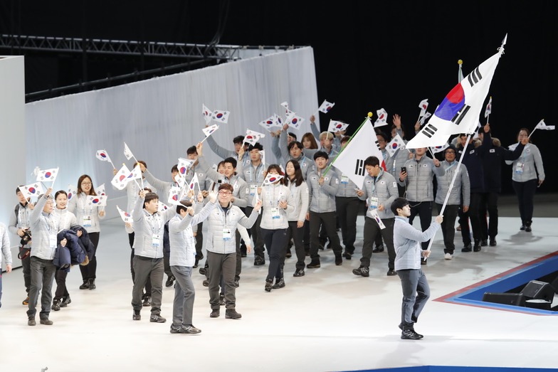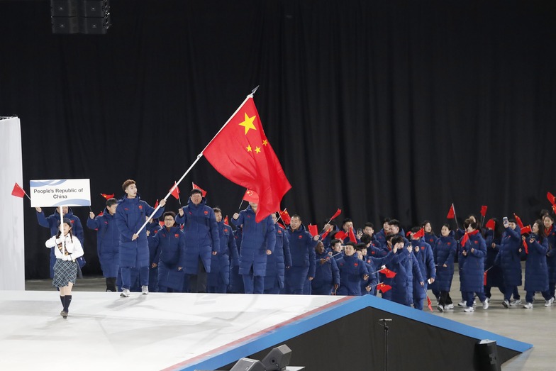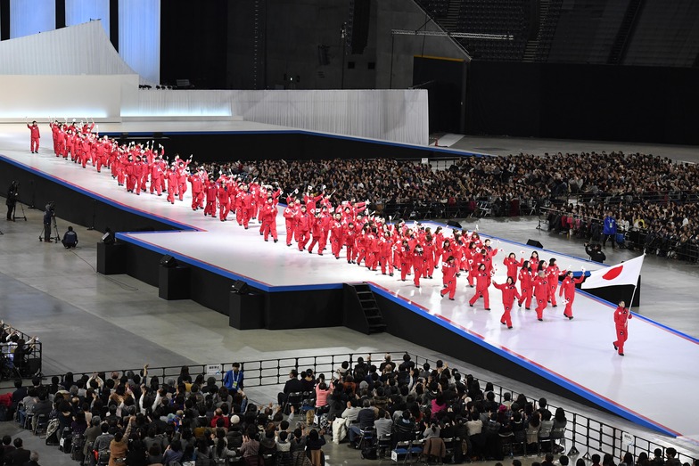 During the first part of the ceremony, national teams marched in, led by China. As guest nations Australia and New Zealand entered with smiles, the final appearance of the Japanese team drew particularly loud cheers.