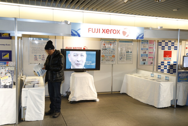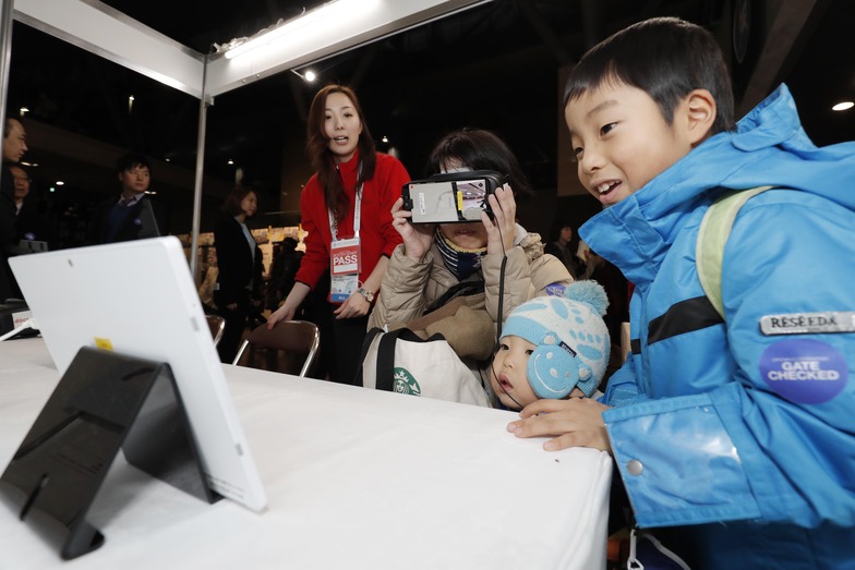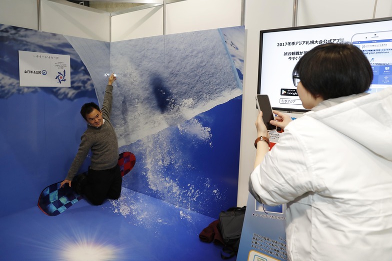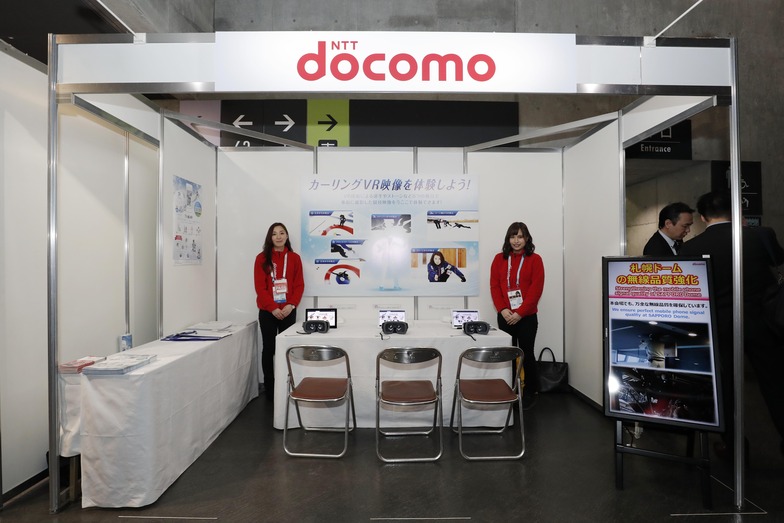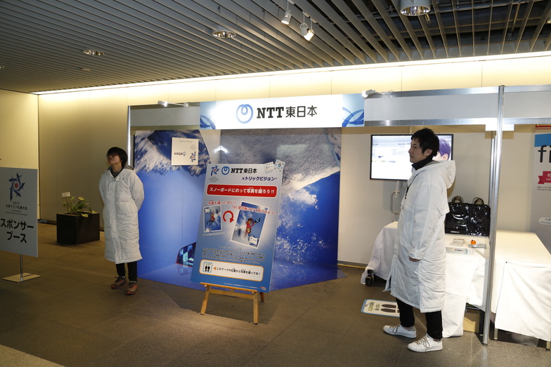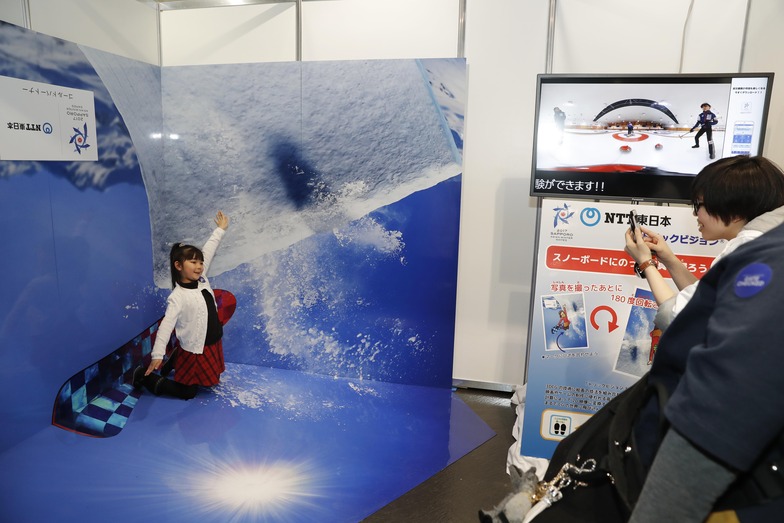 NTT East exhibited a booth where visitors could take photos of themselves snowboarding. NTT Docomo set up a corner offering a virtual curling experience.
