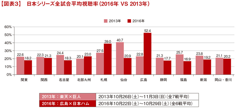 The fervor in Hiroshima Prefecture, the Carp's home turf, was particularly noteworthy during this tournament. Compared to the 2013 tournament, where Rakuten's first championship victory after overcoming the Great East Japan Earthquake also sparked local excitement, the intensity in Hiroshima was undeniable. The average viewership rating for the tournament in the Hiroshima region reached 52.4%, exceeding half of all households. Thus, the 2016 Japan Series sparked a localized fever pitch that couldn't be gauged solely from the Kanto region's viewership rankings [Figure 3].