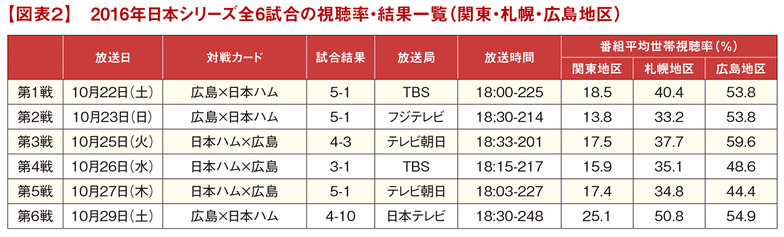 The Hiroshima Toyo Carp, whose "divine" performance earned them the 2016 Buzzword of the Year award, clinched their first league championship in 25 years, receiving extensive media coverage. The final Game 6 of the Japan Series, where they narrowly lost the championship to the Hokkaido Nippon-Ham Fighters, recorded a 25.1% rating even in the Kanto region.