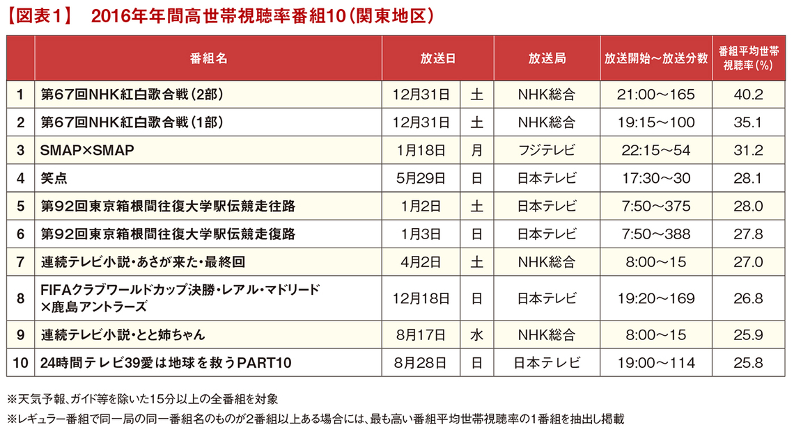 First place went to NHK's "Kōhaku Uta Gassen" (Red and White Song Battle). While the generational shift among performing artists became a talking point, the program demonstrated its strength once again, with Part 2 exceeding 40% for the first time in two years. Following "Kōhaku" were long-running programs reaching milestones: Fuji TV's "SMAP×SMAP," which ended to much regret, and Nippon TV's "Shōten," hosted for the first time by Shōfukutei Shōta. Furthermore, alongside the ever-popular "Hakone Ekiden," the top 30 also featured the "FIFA Club World Cup," "NPB Japan Series," and "Rio de Janeiro Olympics," making it a year full of sports excitement.