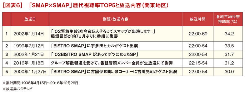 Looking back at 2016, SMAP×SMAP remained a focal point throughout the year—from the dissolution rumors in mid-January, through the official announcement in August, to the group's final year-end broadcast. It consistently served as the venue where all members gathered. Let's revisit the footprints of this flagship program for Japan's national idols, who have consistently led the entertainment world, alongside its ratings [Chart 6].
