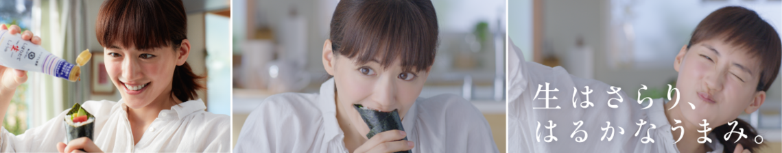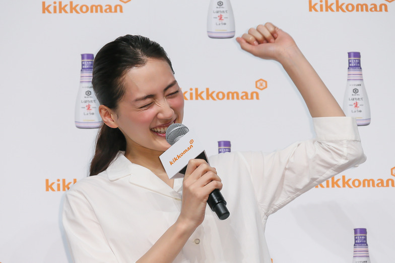 Regarding the commercial, Ayase shared an anecdote with a beaming smile: during the scene where she expresses deliciousness with "Mmm~!" she found the hand-rolled sushi so tasty that she kept eating even after the cut signal, surprising the staff. Ayase, who uses "Freshly Squeezed Raw Soy Sauce" in her daily life, commented on her favorite points: "Unlike regular soy sauce, it's clear and vibrant in color. It makes anything you put it on taste delicious, and it's convenient because you can use just one drop by squeezing the bottle."