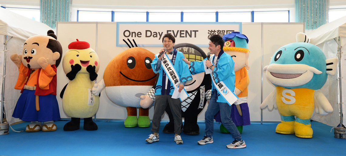 The two comedians introduced six characters with their witty banter, performing their signature "Welcome~!" gag. These included "Hideyoshi-kun" (Nagahama City), modeled after Toyotomi Hideyoshi; "Mori-san" (Moriyama City), a firefly fairy; "Ninjaemon" (Kōka City); and "Caffy" (Shiga Prefecture).