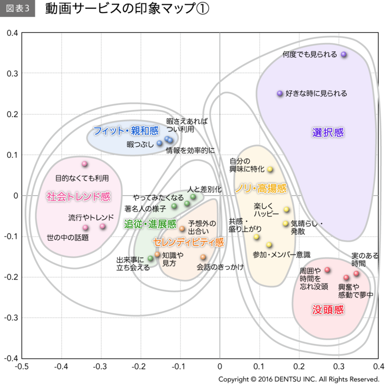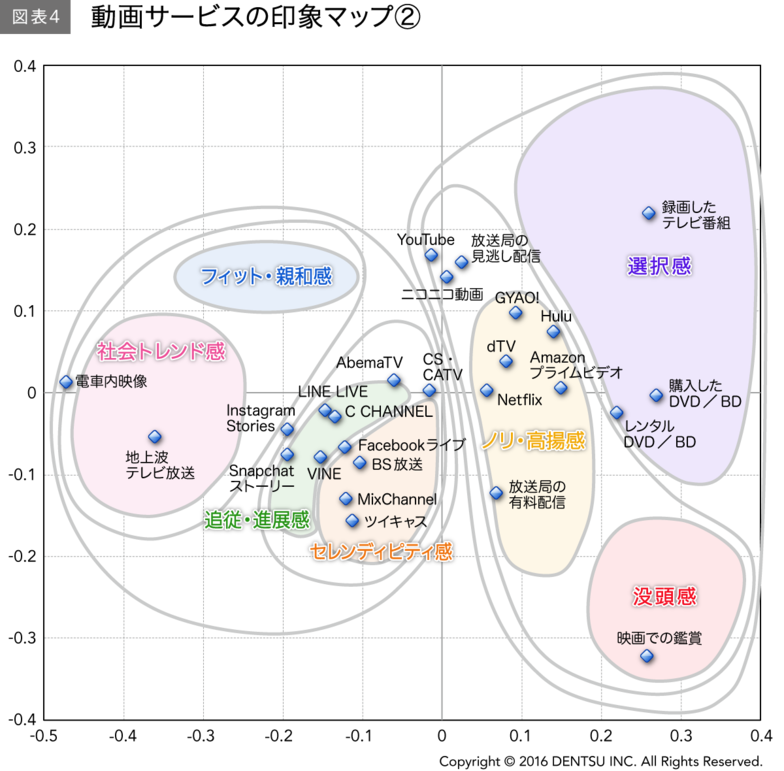 While simply called "video," opportunities to view it continue to expand, starting with watching movies in theaters, then TV broadcasts, packaged media like DVDs, online streaming or sharing services, and more recently, communication via social media, displays on trains, and outdoor building screens. Therefore, we decided to create a current "map" of video experiences from the user's perspective by investigating how much users' impressions of diverse video media and services overlap and where they differ.