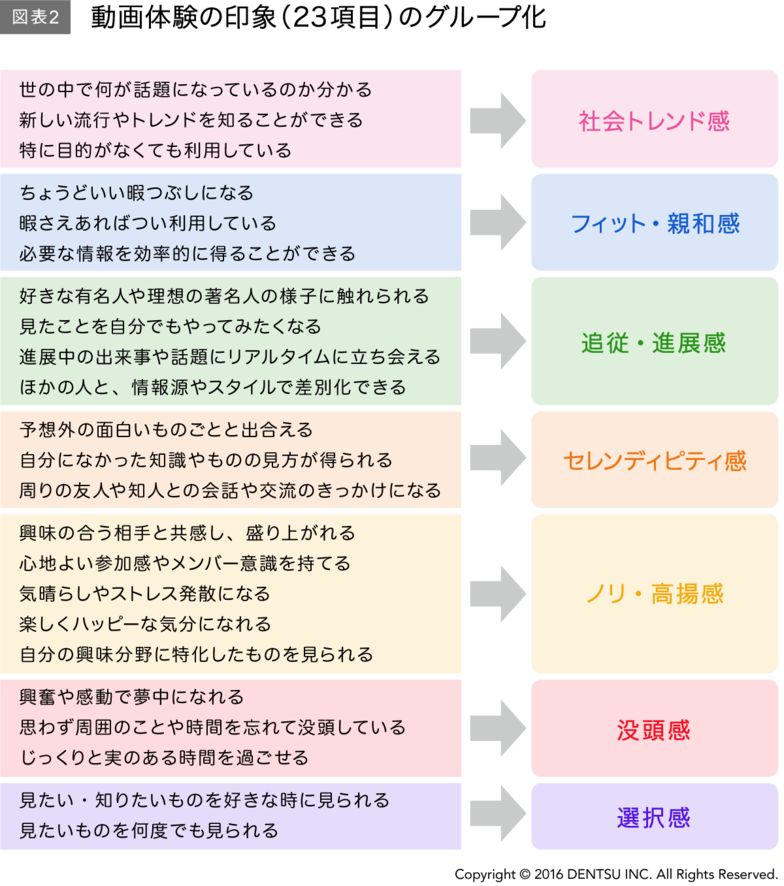We then established 23 items representing the impressions users perceive from these 26 types of video media and services, asking whether each applied. The responses were statistically grouped into seven domains (Figure 2).