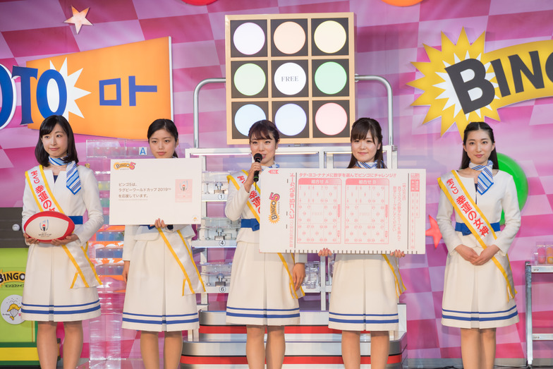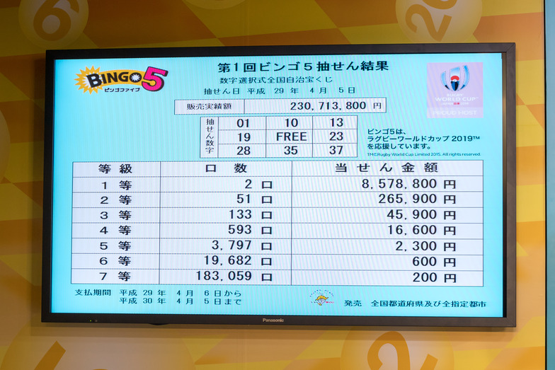 Bingo 5 is based on the bingo game. It features a grid of 9 squares arranged in 3 vertical and 3 horizontal rows. Players select numbers from the 8 squares excluding the center square. If one or more of the 8 lines (vertical, horizontal, or diagonal) match the drawn numbers, it's a win. The number of matching lines determines the prize tier from 1st to 7th place. The theoretical 1st prize amount is approximately 5.6 million yen. Sales began on the 3rd. A portion of the proceeds will support the "Rugby World Cup 2019," and the lottery tickets feature the tournament's official mark.