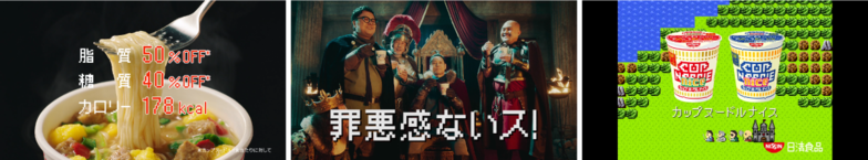These products are richer than regular Cup Noodles while featuring 50% less fat, 40% less sugar, and about half the calories of the standard version. At the March launch event ( http://dentsu-ho.com/articles/5031 ), they were introduced as new products with "unbelievable specs!" that let you eat "without guilt!"