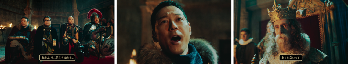 The commercial features four personalities: comedian Koji Higashino, manga artist and talent Yoshiaki Ebisu, comedian Kazuya Kubota of the duo Toro Salmon, and Ryota Sakai of Onigoe Tomahawk.