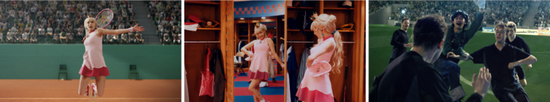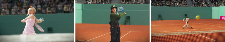 The commercial depicts the real-life adventures of Mario and his friends as they get swept up by players enjoying "Mario Sports Superstars." While everyone is enjoying golf, they're suddenly summoned to a tennis court for a match. Then it's baseball, soccer, and horse racing – the four are tossed around by the whimsical players. Amidst it all, you see Mario and the others desperately playing while refueling with Dekavit, showcasing their fast-paced action and human-like banter.