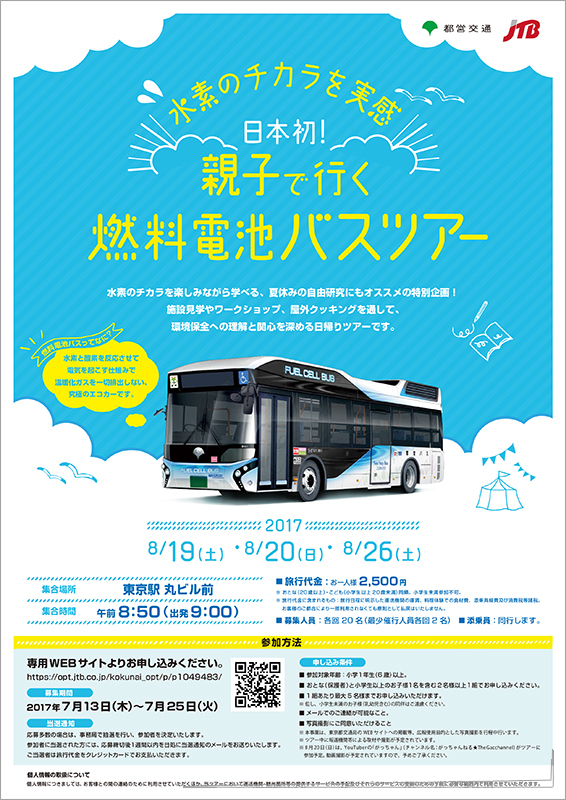 As part of its "PROJECT TOEI" information dissemination initiative for metropolitan transportation, the Tokyo Metropolitan Bureau of Transportation will collaborate with JTB Domestic Travel Planning to conduct the "Experience the Power of Hydrogen! Parent-Child Fuel Cell Bus Tour" on August 19, 20, and 26. This tour using fuel cell buses marks Japan's first attempt at a packaged tour of this kind.