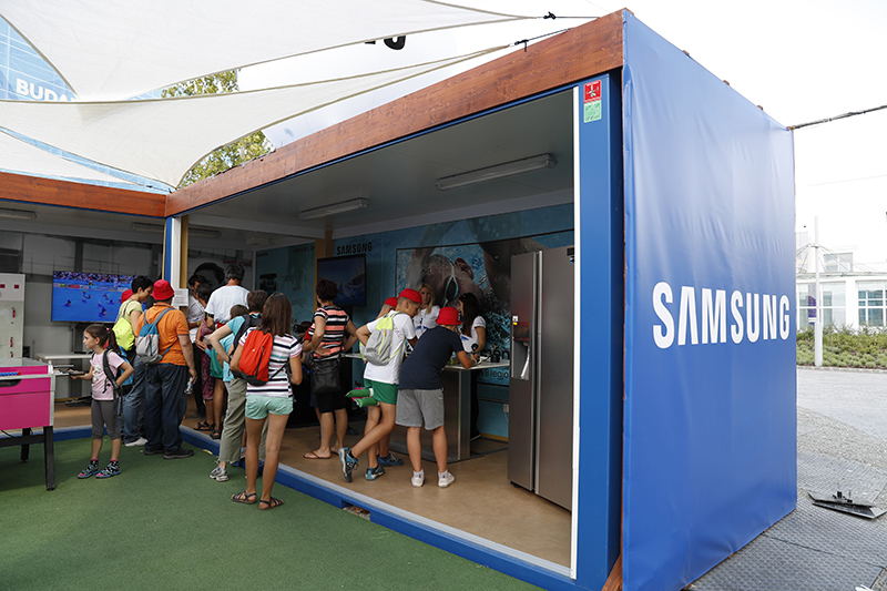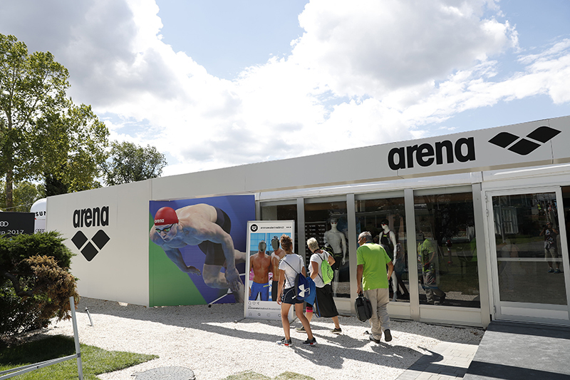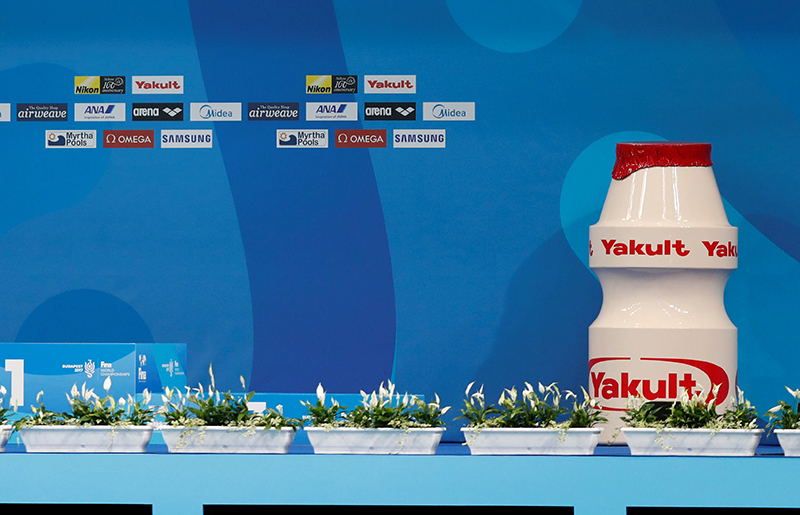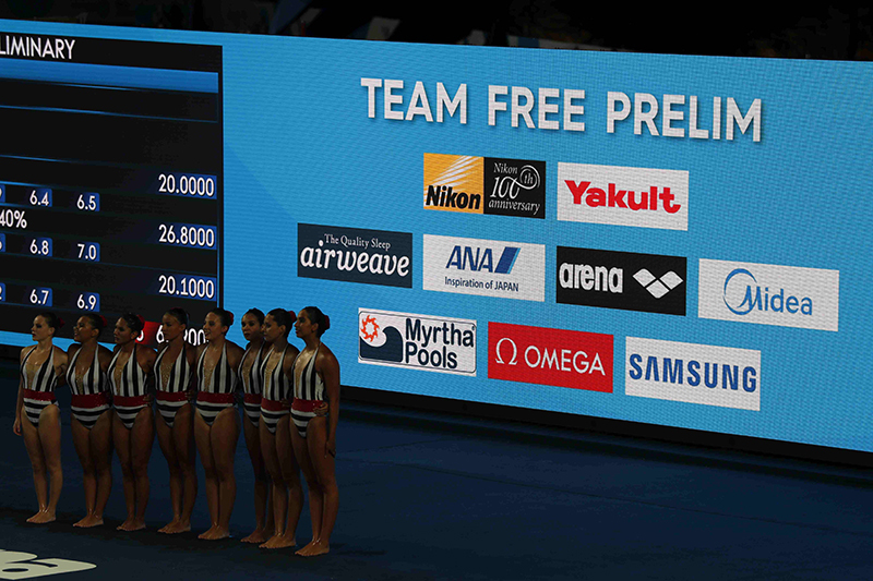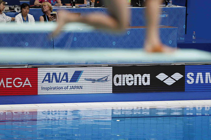 Companies like Yakult Holdings, an Official Partner of FINA since 2005, Nikon, a partner since 2007, and ANA, which signed a partnership agreement in 2015, primarily displayed their company names at venues, on athletes' bibs, and swimming caps, while also offering unique services. Some partners also set up shops and booths to promote themselves.
