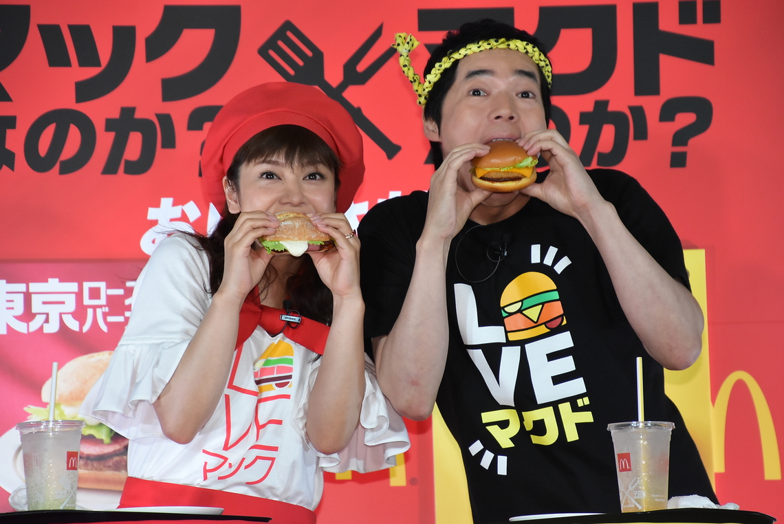 After tasting the Tokyo burger, which features three slices of roast beef and 100% beef patty sandwiched with a special sauce, Hira remarked with a smile, "It's rich and full of flavor. It lets you enjoy an elegant moment." Meanwhile, Imada praised the Osaka burger, featuring a beef cutlet patty with cheddar cheese: "The rich sauce and crispy coating. It's not overly heavy, just refined." He then energized the crowd by quoting Hira's husband, soccer player Yuto Nagatomo: "This burger is a kind and strong ally for single men like me who don't have an amore!"