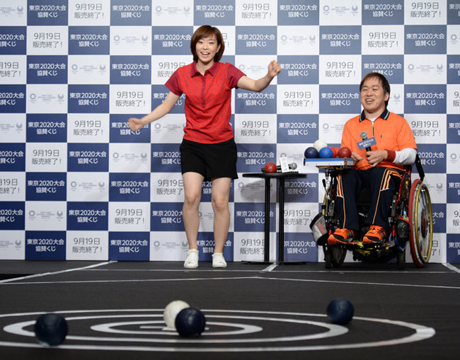 On stage, they experienced boccia alongside Takahiro Ueno, one of the lottery's "Goddesses of Fortune." Ishikawa's first throw overshot the field considerably. "I threw it like a table tennis smash," he admitted. However, after advice from Hirose, his second throw landed the ball in an excellent position. Perhaps his medalist pride couldn't accept the result of his first throw, Hirose challenged the second throw himself. He demonstrated a throw that grazed the jack ball (target ball), showcasing a throw worthy of actual competition.