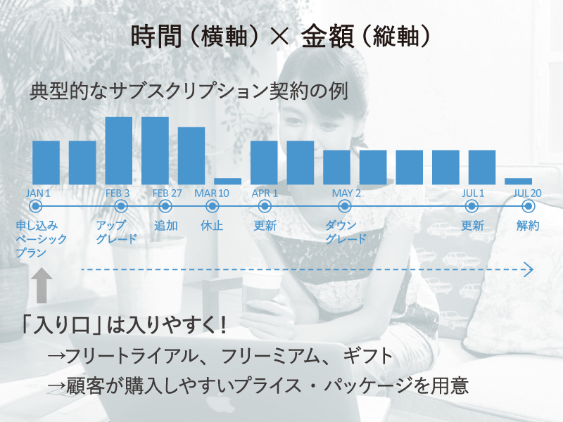 In subscription-based business, the focus is not only on acquiring customers but also on "sustaining" the relationship (i.e., the usage contract) with acquired customers. Essential to this is offering a variety of plans and multiple choices.