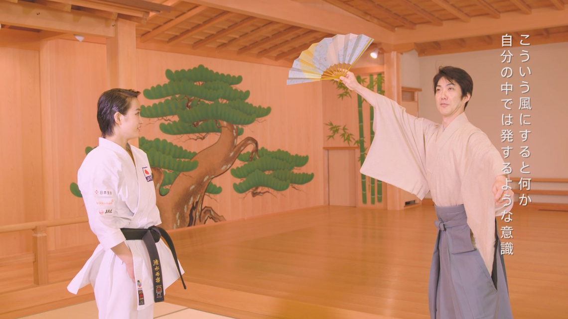 At the start of the video, Shimizu performs a powerful kata demonstration before Nomura. Impressed, Nomura asks Shimizu a series of questions, probing the essence of her art. They also explore the similarities and differences between kyogen and karate while each demonstrates their respective kata.