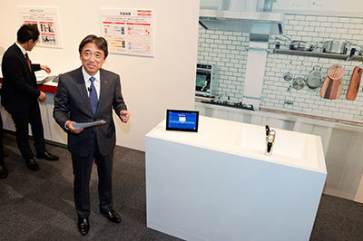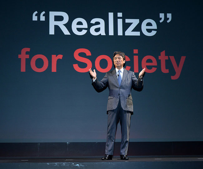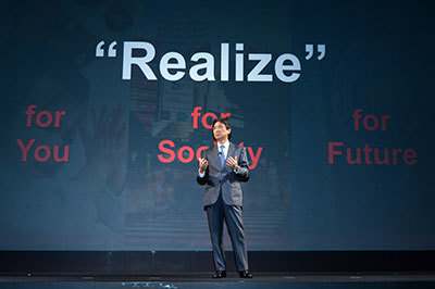 President Kazuhiro Yoshizawa took the stage at the outset to deliver a presentation. President Yoshizawa stated that the theme for this event was "Realize" – putting into action the mid-term strategy 2020 "beyond declaration" formulated in fiscal 2017. He introduced the three pillars: "Realize for 'You'", "Realize for 'Society'", and "Realize for 'Future'", explaining the new products and services under each.