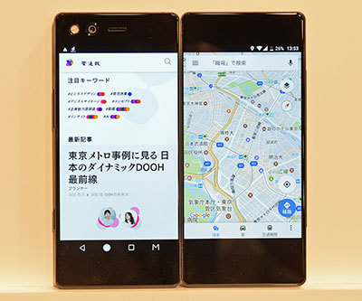 The "M" offers flexible use whether held wide or upright. It allows users to search the web while composing emails or display maps on a large screen combining both displays, enabling usage tailored to the situation. As a global model originating from Docomo, it is scheduled for sale through carriers worldwide, including Vodafone and AT&T.
