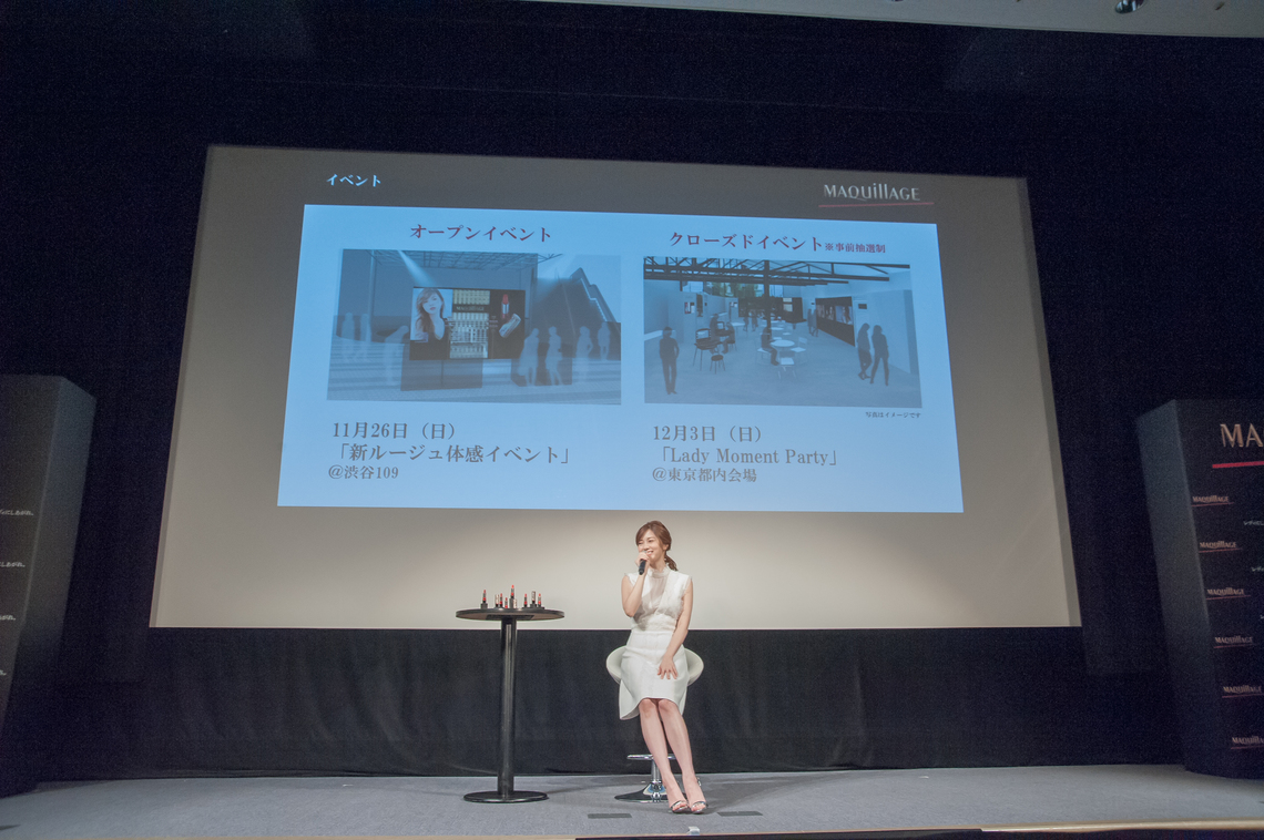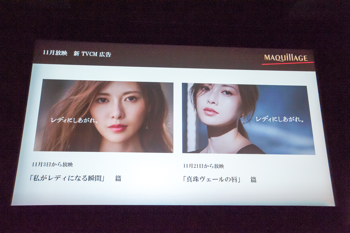 On November 2, Shiseido held a new TV commercial unveiling and new rouge launch event for its total makeup brand "MAQuillAGE" in Minato Ward, Tokyo. The brand has appointed Nogizaka46's Mai Shiraishi as its new muse. The new TV commercial "The Moment I Become a Lady" will air starting November 3rd. The new TV commercial for the new product "Dramatic Rouge P," titled "Lips Veiled in Pearl," will air starting November 21st, the product's launch date.