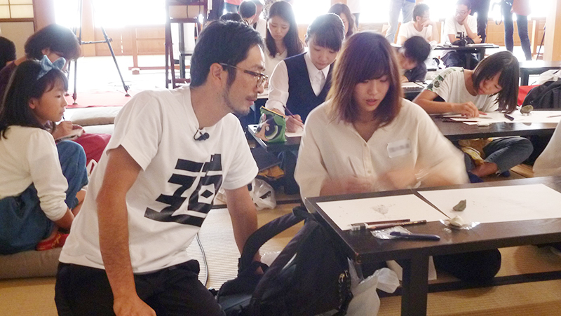 Since his meticulous paintings based on imagination are so popular, we asked Mr. Ikeda to teach a class on "Imagination Studies." The workshop involved "picking up stones from Saga Castle, loading them with imagination, and painting." I'll write about that session, along with the upcoming lectures, in a future post.
