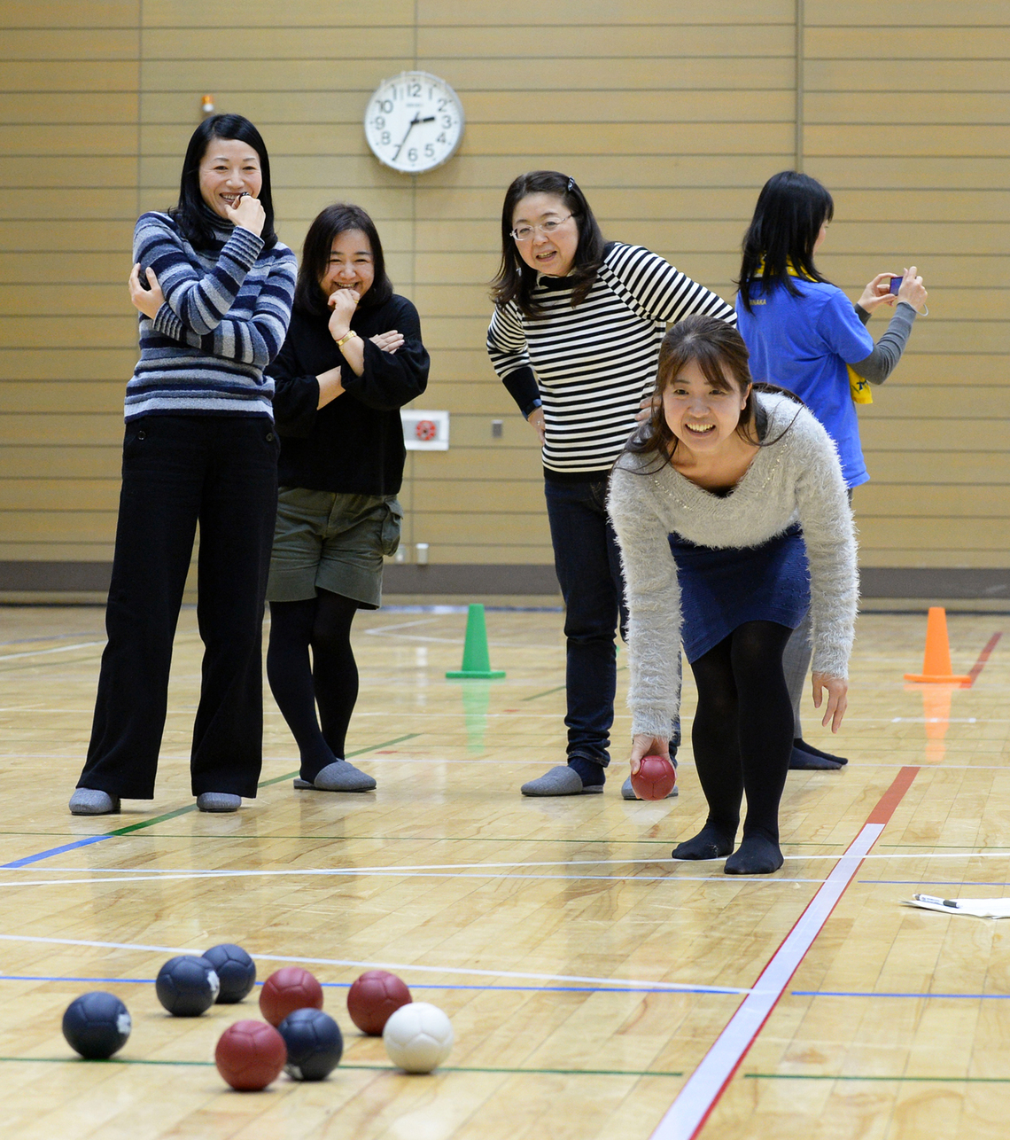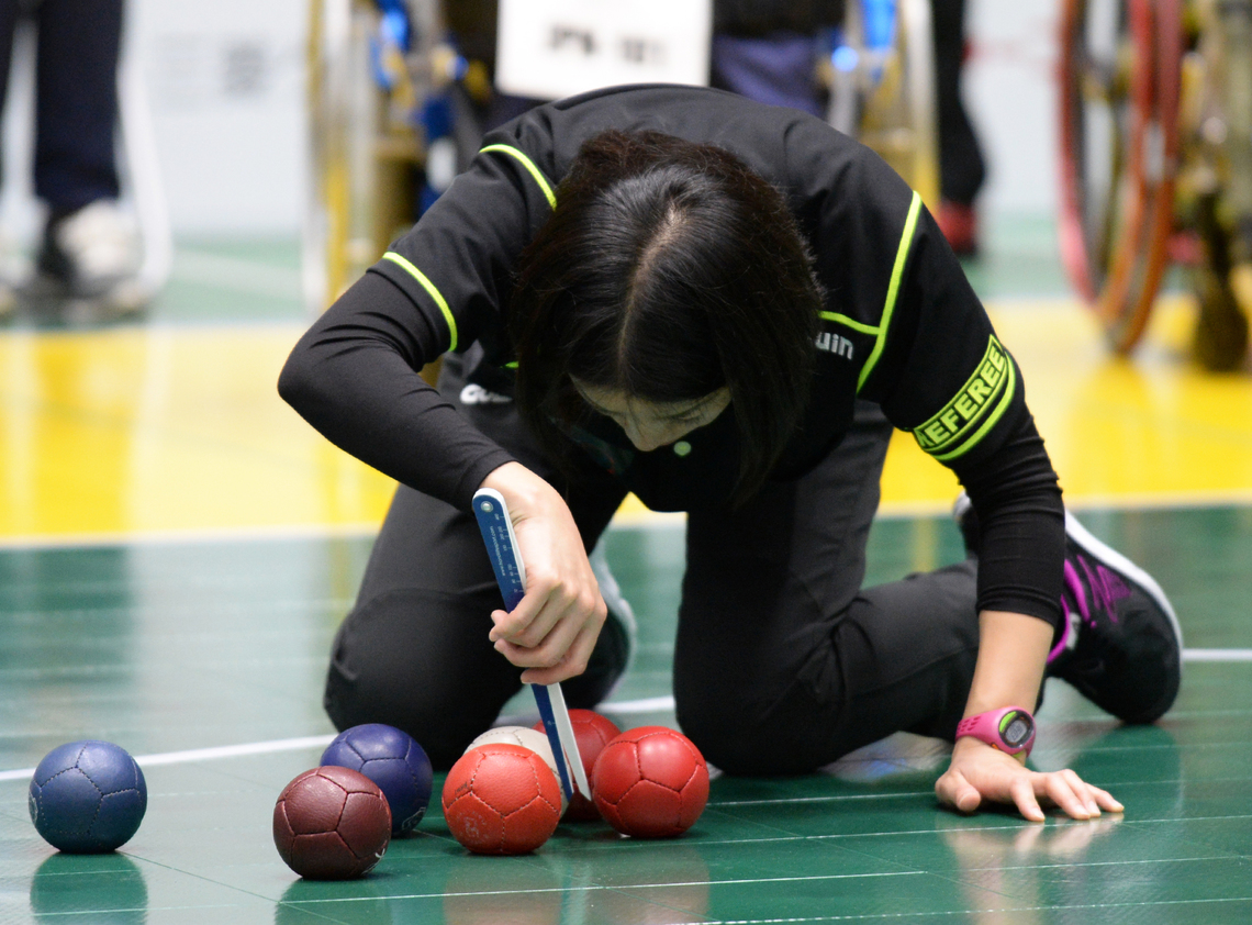Boccia was developed in Europe for individuals with severe cerebral palsy or equivalent severe limb impairments. Players compete by throwing or rolling colored balls (red and blue) toward a target ball (jack ball) on the court, aiming to get their balls closest to the jack ball. Athletes unable to throw the ball due to their disability (BC3 class) use a ramp to convey their intent to an assistant, who then rolls the ball. The sport has no gender distinction. Players are classified by the type and severity of their disability (BC1 to BC4) and compete in individual, pairs, and team events.