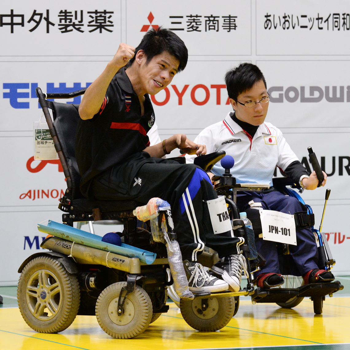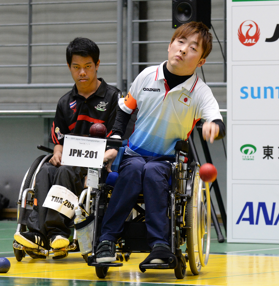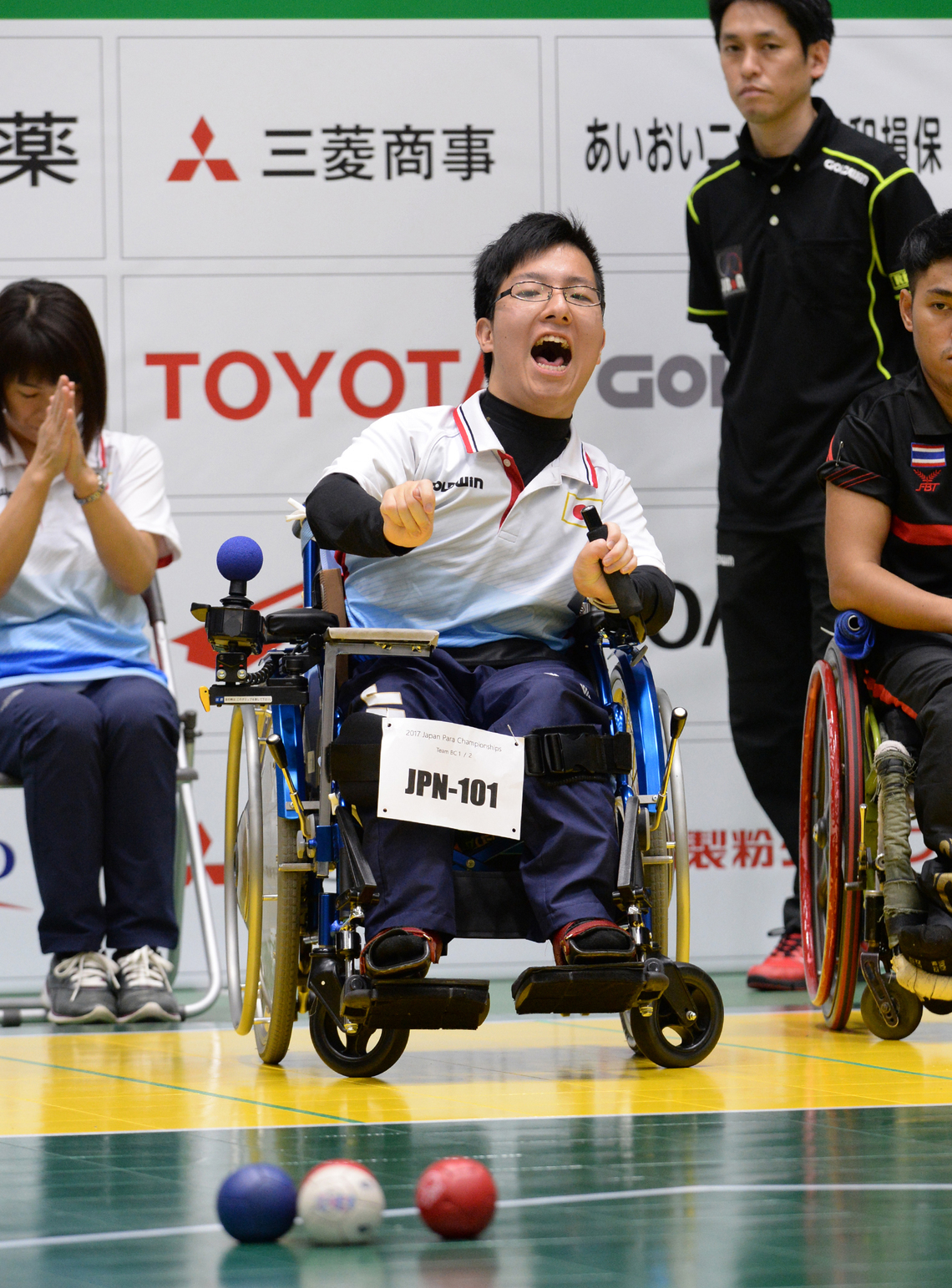 The second match between Japan and Thailand in the "Team BC1-2" class on the 19th was a thrilling contest worthy of the tournament's final game. The back-and-forth battle ended in a tie after six games, forcing a tiebreaker (extra innings). Japan's players, including Hidetaka Sugimura and Takayoshi Hirose, delivered superb throws. When Thailand's final throw, aiming for a comeback, missed, both players and spectators erupted in joy.