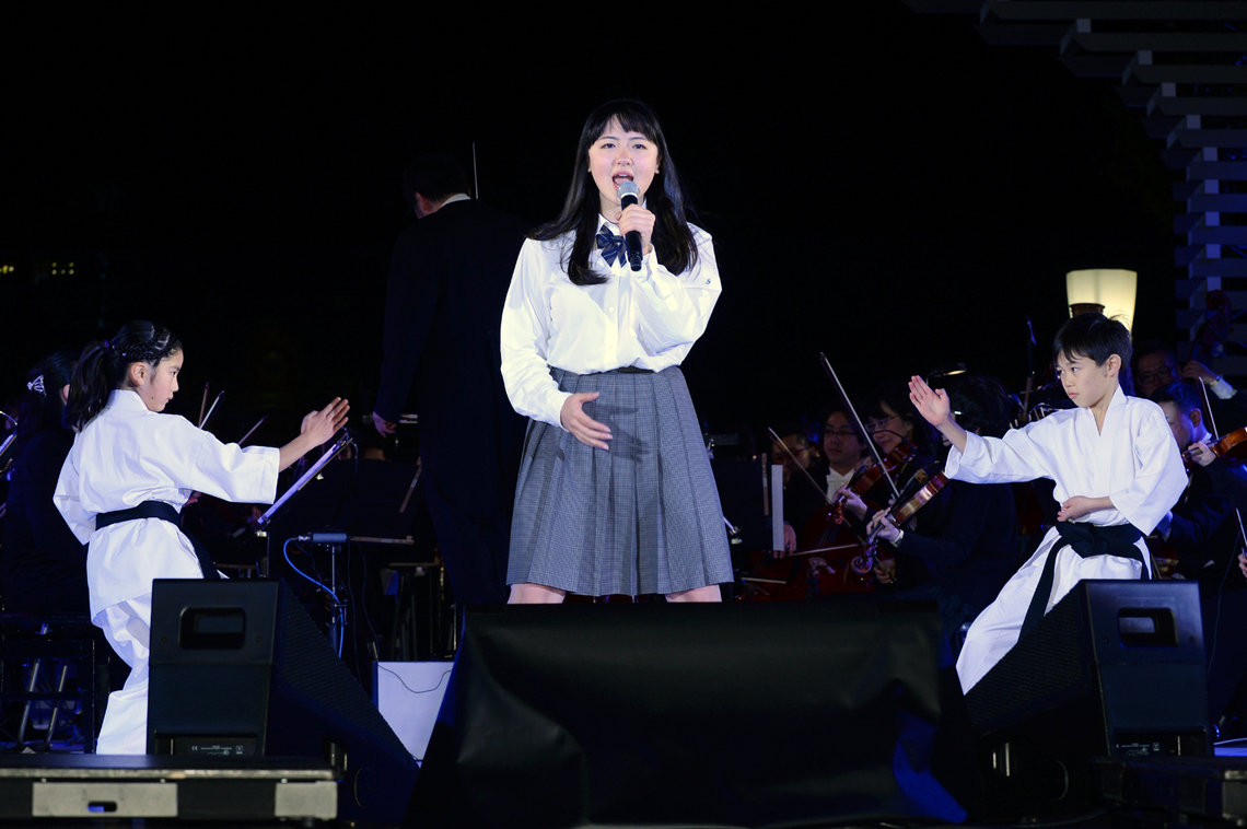 "We Will Rock You" featured the powerful vocals of gospel singer Emiko Suzuki, enhanced by the martial arts performance of young karateka dancers and the dance by the Komagawa High School Dance Club, energizing the venue.