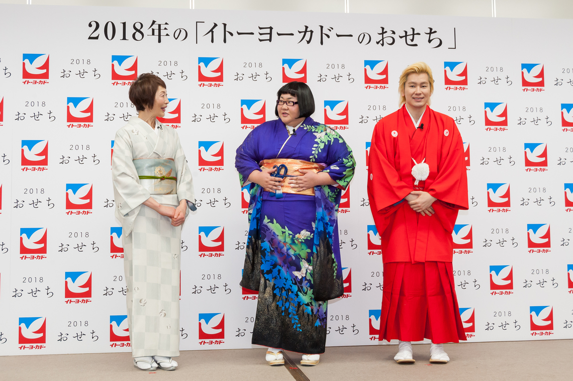Next, comedians Natsu Ando and Kazureza from the duo Maple Chogokin took the stage. Ando, dressed in a kimono for the New Year, drew laughter by joking that her tightly cinched obi made her feel "tightened up." Kazureza, dressed in bright red traditional attire, muttered upon seeing her, "She disproves the theory that kimonos make you look stylish."