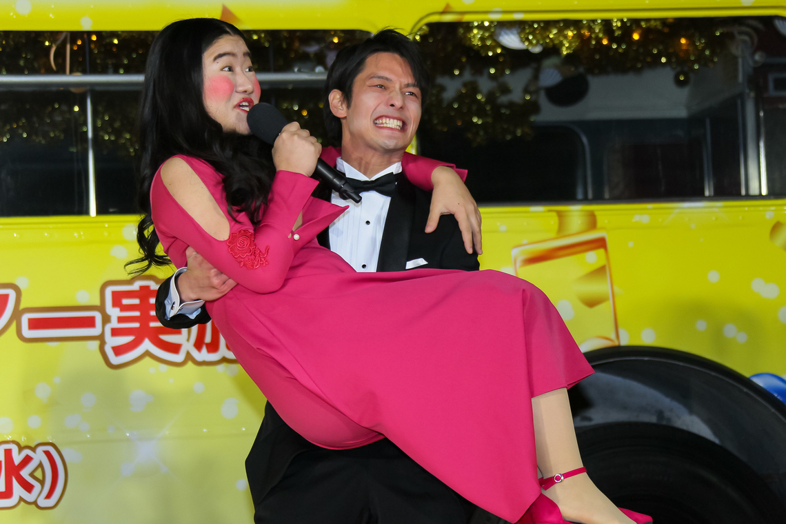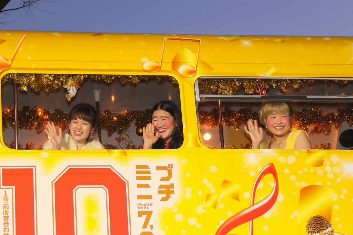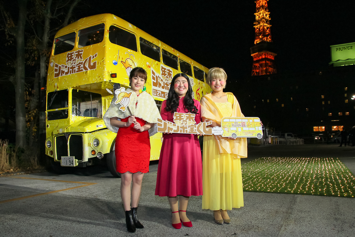The day before, on the 6th, a PR event was held at the Tokyo Prince Hotel in Minato Ward, Tokyo. Actress Miwako Kakei, who appears in the Year-End Jumbo TV commercials, along with Yoshiko and Mahiru from the young comedy duo Ganbare Ruya, arrived at the venue riding a specially wrapped London bus.