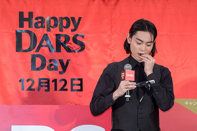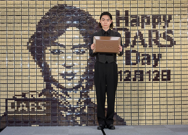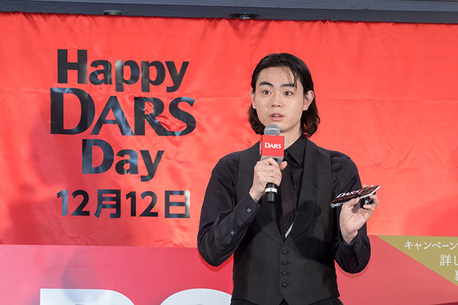 He concluded with a big smile, shouting, "What I want to say is simple. On Dars Day, let's all eat Dars!" and added, "Chocolate is just plain delicious. I don't think words are needed. I want everyone to enjoy eating it together, and I hope you all do."