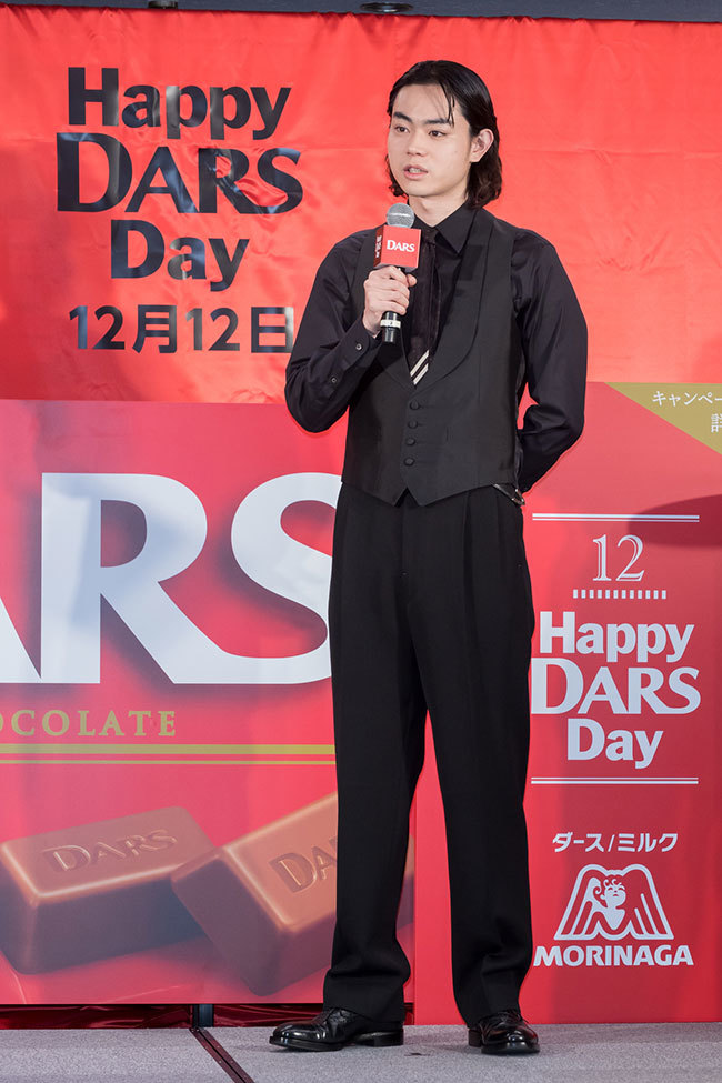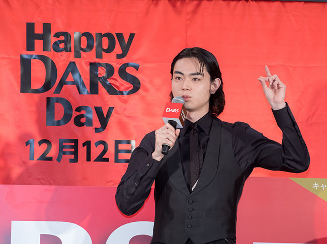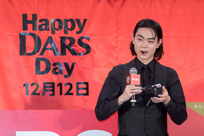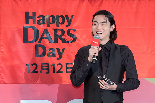 Actor Masaki Suda, the product's image character, made a surprise appearance at the venue. In the TV commercials airing since the 6th—"DARS Red Suda-san DARS Day," "DARS Black Suda-san DARS Day," and "DARS White Suda-san DARS Day" (each 15 seconds)—he takes on three roles, inspired by the three flavors: milk, bitter, and white. He portrayed: "Red Suda-san," a passionate character with a pure heart who believes in fate and is sweet to women; "Black Suda-san," a cool character with a scheming nature who won't hesitate to cut corners to achieve his goals; and "White Suda-san," whose unique hair and clothing, along with his aura, attract people.