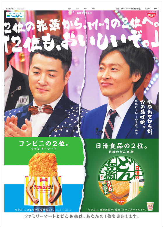 FamilyMart, also a sponsor of the show like Nissin Foods, ranks second in store count within the convenience store industry. Both brands, connected by their "second place" status, collaborated on their Twitter accounts during the Grand Prix period and further placed a newspaper ad in the Asahi Shimbun, the second-largest national newspaper by circulation.
