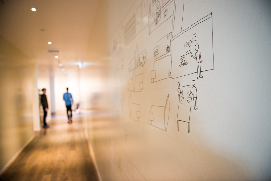 The entire wall on the first floor of the Odaiba office is a whiteboard created using IdeaPaint