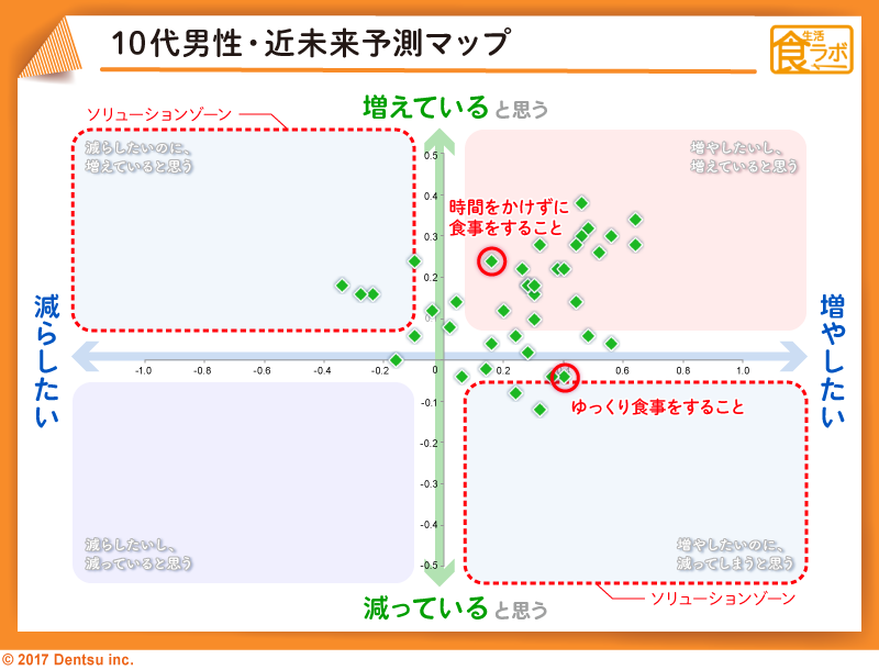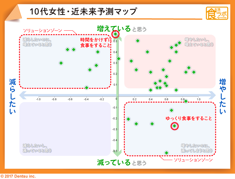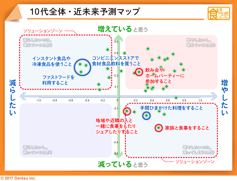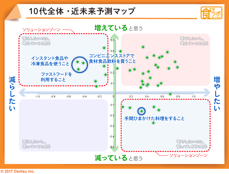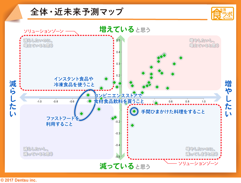Looking at the items plotted in the Solution Zone: In the upper-left "Want to reduce but likely to increase" zone, items related to easy and convenient food appear, such as "instant and frozen foods," "convenience stores," and "fast food."