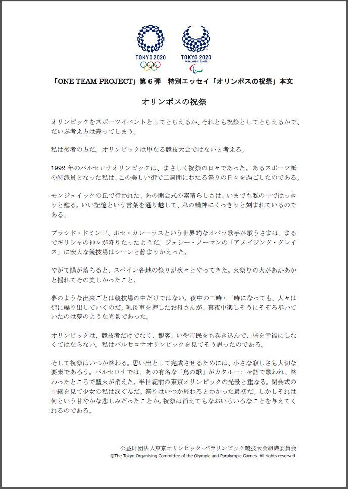 On January 15, the Tokyo 2020 Organizing Committee released "Olympus Festival," a video featuring actor Ryohei Suzuki reading a special essay by writer Mariko Hayashi in both Japanese and English as the sixth installment of the "ONE TEAM PROJECT." (Image provided by Tokyo 2020)