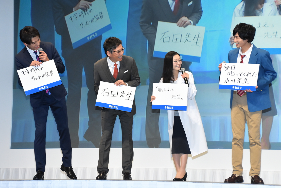 Attending the event were actor Ryohei Takeuchi, who stars in the new "Student Discount Teacher" TV commercial, along with Katsuhisa Namase as the vice principal, Mitsu Dan as the female teacher, and Jun Shison as the student. They appeared in the commercial's costumes, including white coats and blazers.