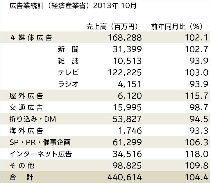 NewsPublished Date: 2013/12/180Advertising Industry Statistics (METI) Sales Up 4.4% - October -Previous articleNext article