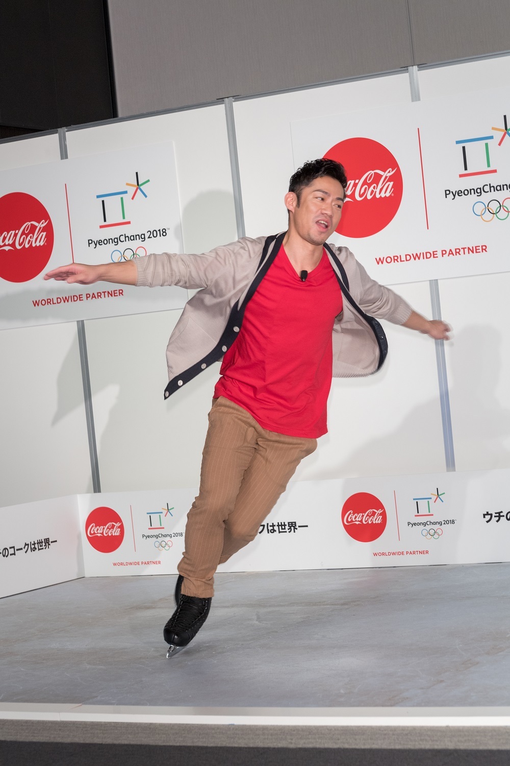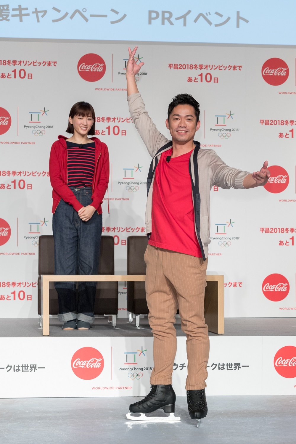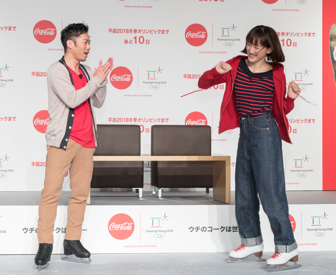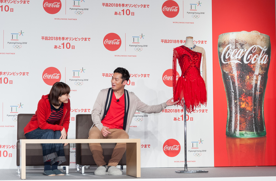 When the Coca-Cola-colored dress Ayase wore in the commercial appeared, Takahashi analyzed, "The PyeongChang Olympics rink has a blue base, so it would look great." He added, "The skirt material is light too. You could wear it just like this in an actual competition."