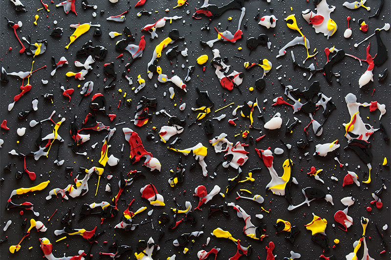 The pieces displayed at their recent solo exhibition looked like this. At first glance, they resemble contemporary paintings created by splattering liquid pigment onto canvas. Yet, this flat black background is also pottery. Fresh glaze is fired onto it, preserving the spherical form of water droplets. It's a world that seems to defy gravity, where time stands still. Next to the work is a sign that says "Please touch" instead of "Don't touch!"—because it is ceramic. You can touch it directly and feel it.