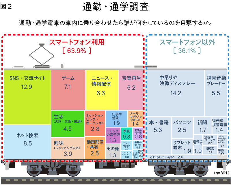 We surveyed people who commute by train at least once a week. We asked: "During your commute, how many days do you use your smartphone, for what purposes, and for how long?" We also asked how many days they engage with non-smartphone media like "advertisements," "video displays," or "books."