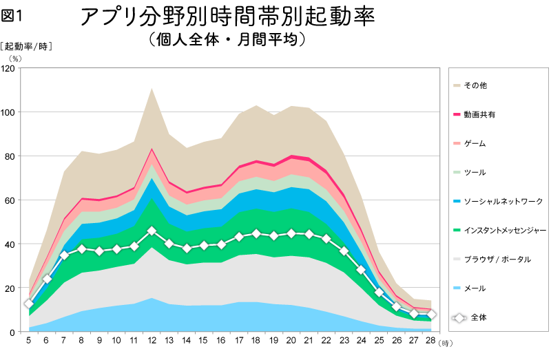 Having grasped the daily biorhythm of app usage, the next point of interest is the actual usage patterns during commutes and school runs in Japan, a country with extensive train travel.