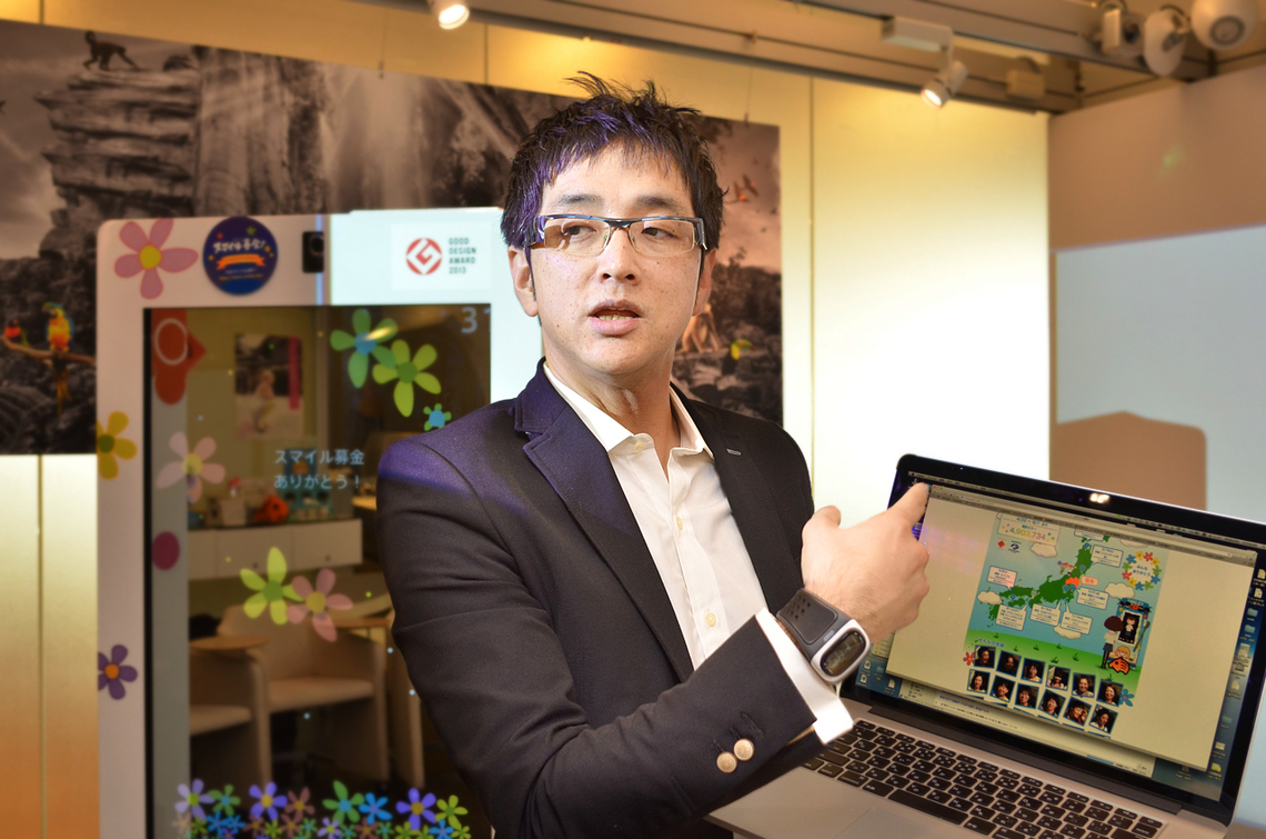 Watanabe: Creating a city requires people. Entertainment is essential for gathering people. With this idea, we developed "Emitame," a smile-saving mirror signage, in collaboration with Koozyt, Inc. When you smile in front of the terminal, the smile recognition system reads information like the degree of upward movement of the corners of the mouth and converts it into points. We installed it in corporate cafeterias and live venues, conducting repeated proof-of-concept tests. We also trialed a charity program where accumulated points funded corporate greening initiatives or donations to support the Great East Japan Earthquake recovery. Thanks to this, we won the 2013 Good Design Award, giving us solid proof of concept.