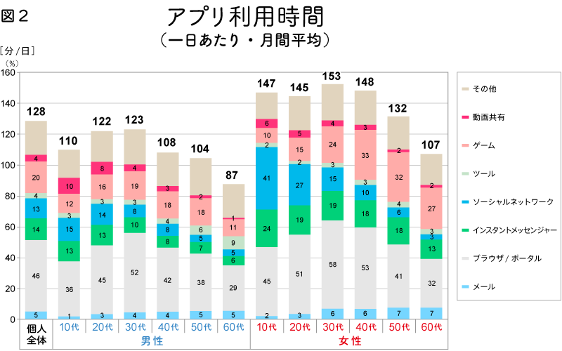 The most frequent launches are for instant messengers like LINE and Facebook Messenger. The light blue above them represents social media like Twitter, Instagram, and Facebook, clearly showing how frequently apps are launched to meet communication needs. Additionally, women launch apps more frequently than men.