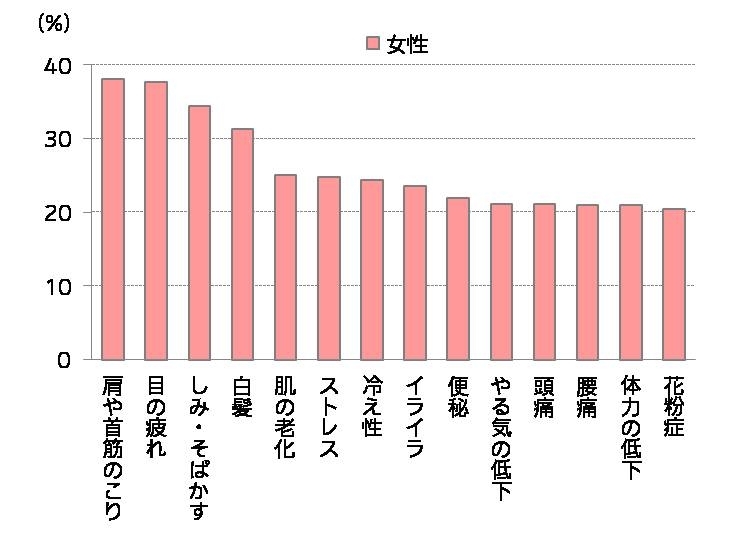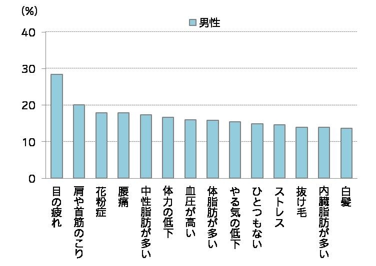 For men, concerns like "high triglycerides," "high blood pressure," "none at all," and "excess visceral fat" ranked high. For women, concerns like "age spots/freckles," "gray hair," "skin aging," "cold sensitivity," "constipation," and "headaches" were prominent. In short, men tend to worry more about issues related to "lifestyle disease risk factors," while women tend to worry more about issues related to "aging" and "discomfort."