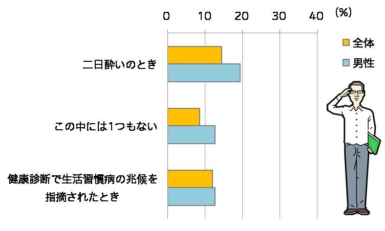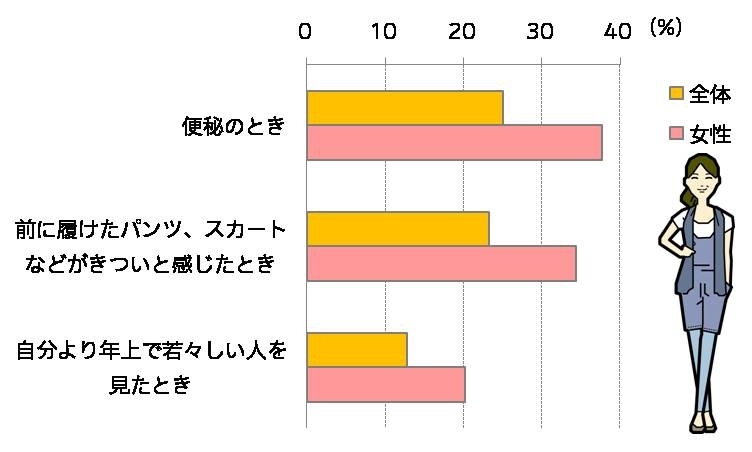 In the Wellness 10,000-Person Survey, the most common response was "when I've had prolonged sleep deprivation." While this ranking holds true regardless of age or gender, breaking it down by gender reveals some differences. For men, scores were higher than the overall average for items like "when hungover," "none of the listed options," and "when lifestyle disease signs were pointed out during a health checkup." For women, distinctive items included "when constipated," "when pants or skirts that used to fit feel tight," and "when seeing someone older who looks younger."